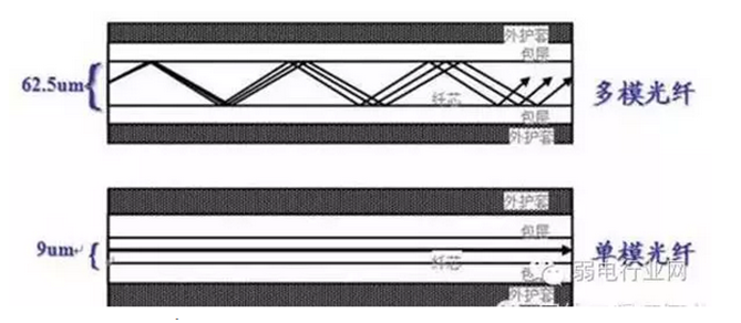 光纤按传输模式来划分单模光纤(Single-mode)和多模光纤(Multi-mode),如下图所示。